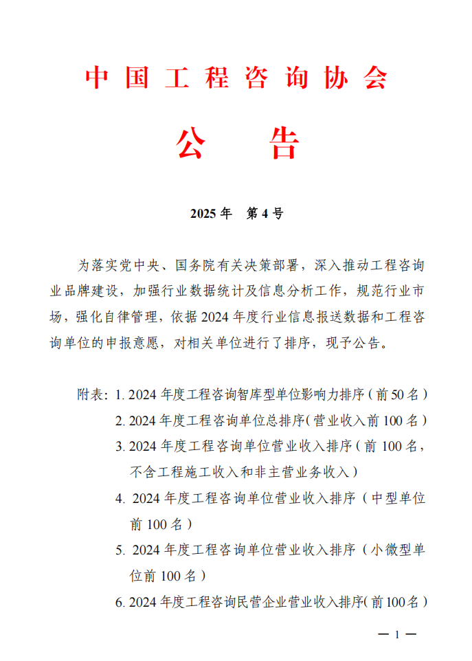 近日,中國工程咨詢協(xié)會(huì)公布了“2024年度工程咨詢行業(yè)智庫型單位影響力排序(前50名)”名單。成咨公司首次入選榜單,位列第46位。