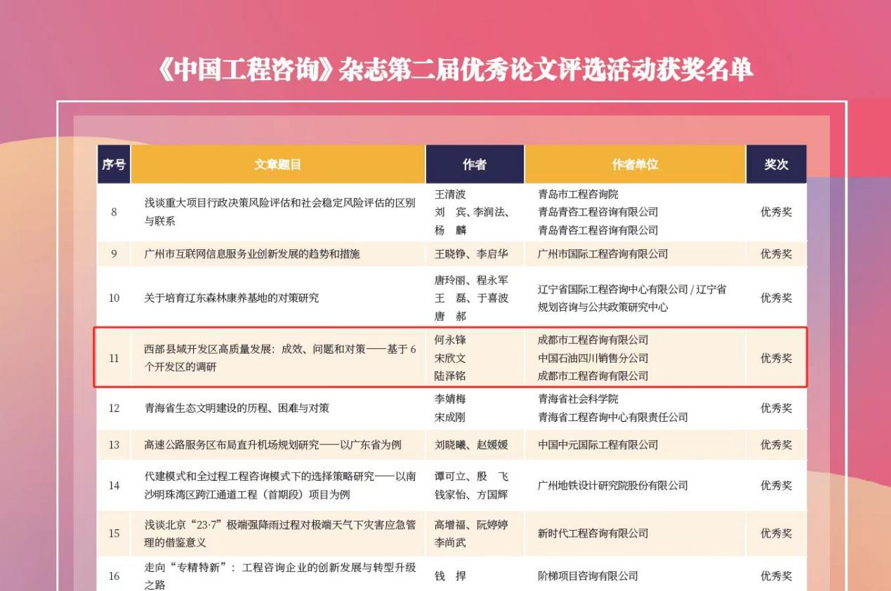 今年5月,四川省工程咨詢協(xié)會開展了2025年度四川省優(yōu)秀工程咨詢成果水平評選工作。經(jīng)過咨詢單位申報、專家初審、復(fù)審、評審委員會終審及公示等多輪嚴(yán)格評審程序,最終獲獎名單于近日正式公布。成咨公司在此次評選中表現(xiàn)突出,共八個項目獲獎,其中,一等獎四項、二等獎三項、三等獎一項,獲獎項目涵蓋課題研究、重大項目咨詢及全過程工程咨詢等多個領(lǐng)域。一等獎:成都超大城市極端天氣預(yù)報水平和應(yīng)對能力提升項目可行性研究報...