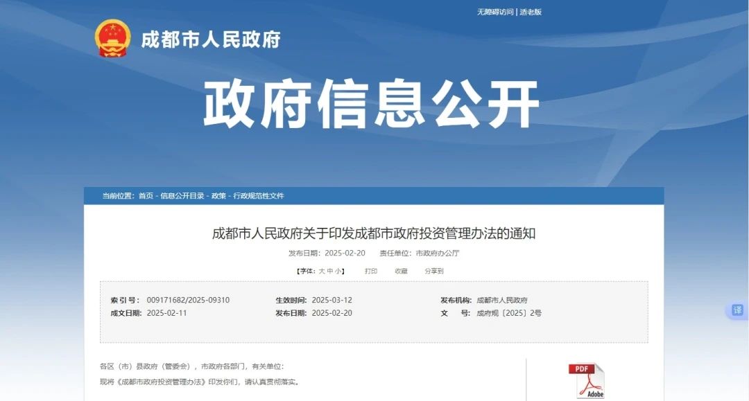 成都市人民政府關(guān)于印發(fā)成都市政府投資管理辦法的通知成府規(guī)〔2025〕2號;各區(qū)(市)縣政府(管委會),市政府各部門,有關(guān)單位:現(xiàn)將《成都市政府投資管理辦法》印發(fā)你們,請認真貫徹落實。
