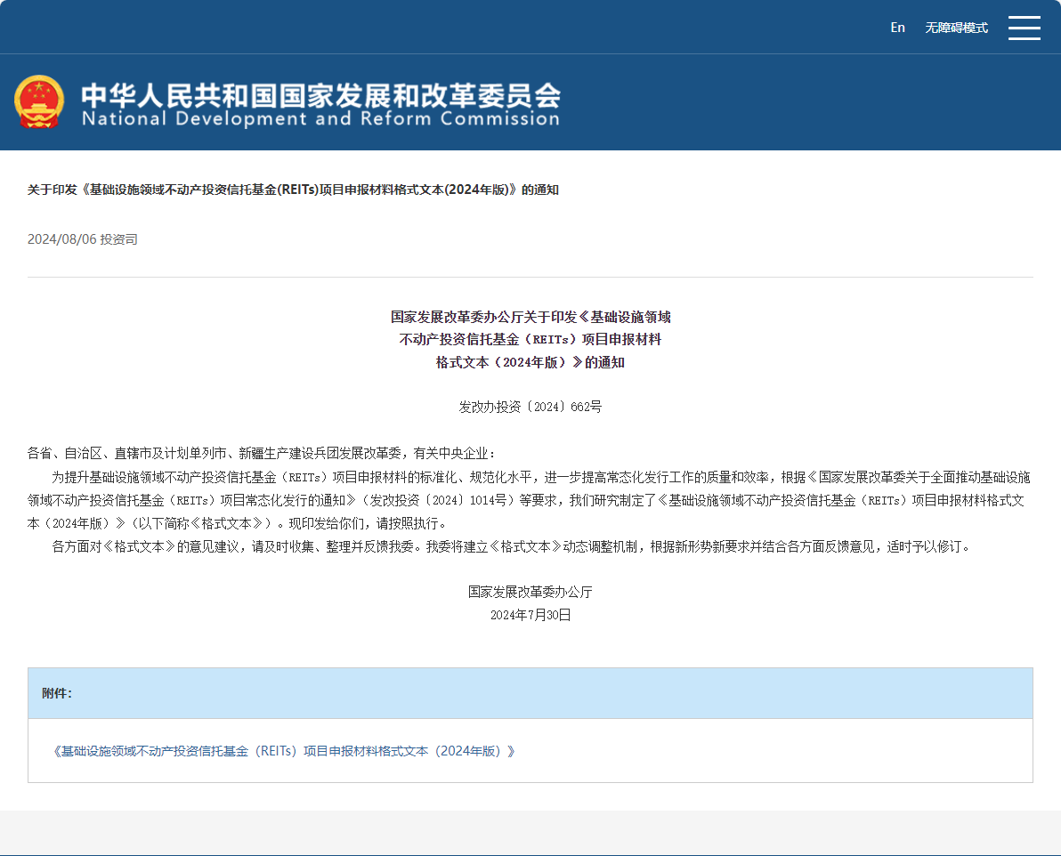 國家發(fā)展改革委辦公廳關(guān)于印發(fā)《基礎(chǔ)設(shè)施領(lǐng)域不動(dòng)產(chǎn)投資信托基金(REITs)項(xiàng)目申報(bào)材料格式文本(2024年版)》的通知 發(fā)改辦投資〔2024〕662號(hào)各省、自治區(qū)、直轄市及計(jì)劃單列市、新疆生產(chǎn)建設(shè)兵團(tuán)發(fā)展改革委,有關(guān)中央企業(yè):  為提升基礎(chǔ)設(shè)施領(lǐng)域不動(dòng)產(chǎn)投資信托基金(REITs)項(xiàng)目申報(bào)材料的標(biāo)準(zhǔn)化、規(guī)范化水平,進(jìn)一步提高常態(tài)化發(fā)行工作的質(zhì)量和效率,根據(jù)《國家發(fā)展改革...